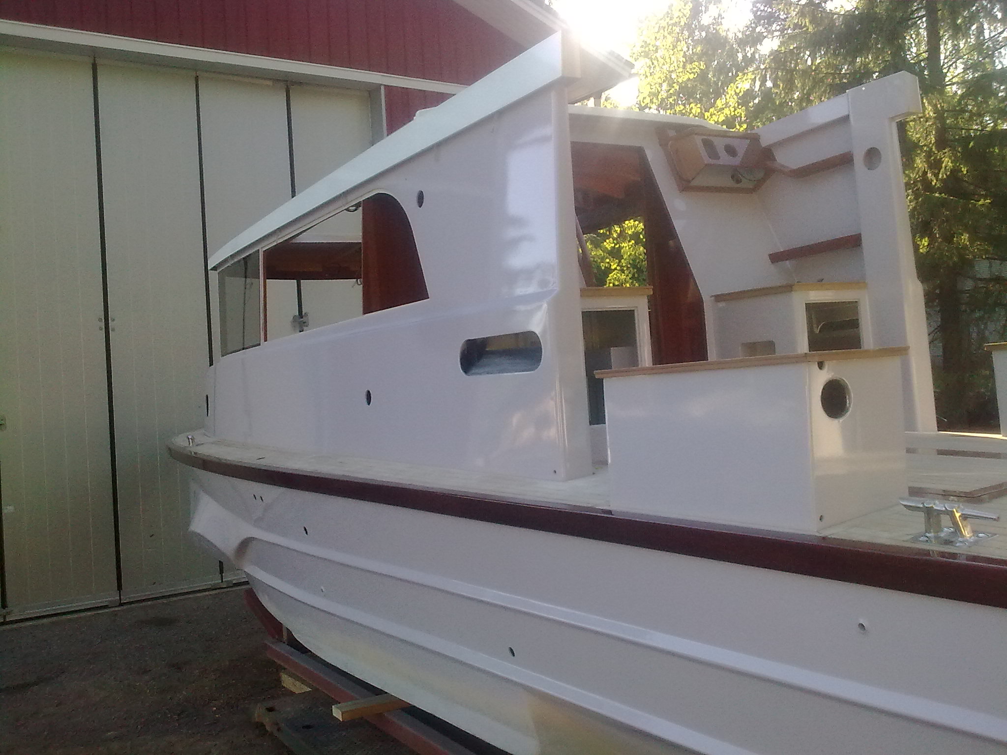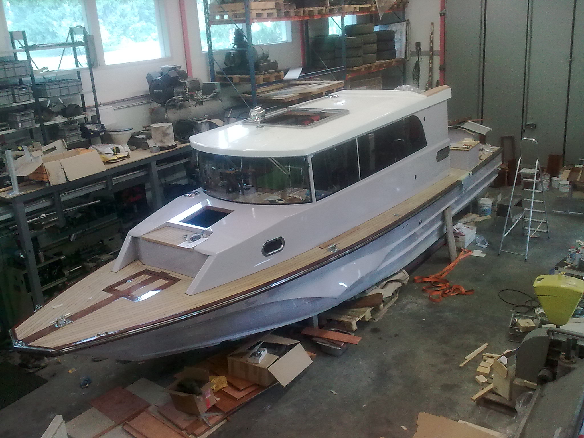 Now painting the hull. New floors have been made, teak on light weight plywood. New red leather sides and panels.