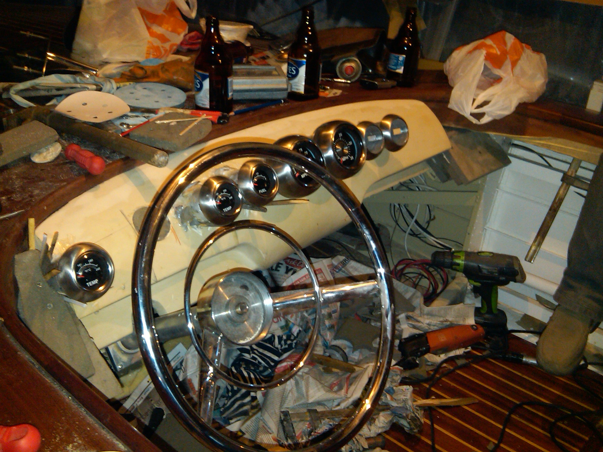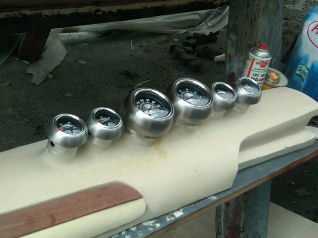 The earlier try to place the seventh gauge next to the portside gauges was disturbing the symetry, we therefor decided to obey the rule to give it the same distance to the steering wheel on the left side.